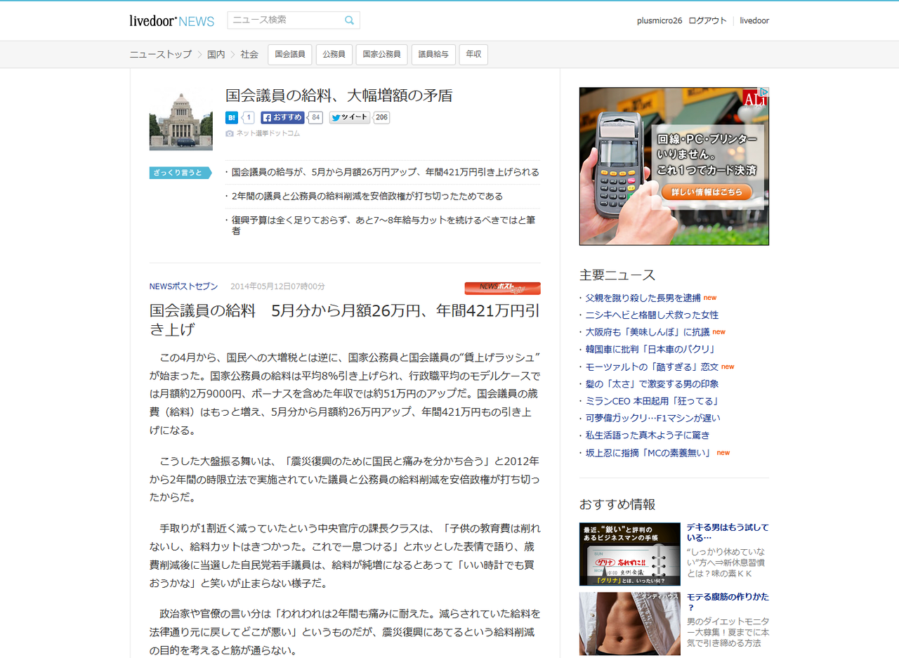 — 威風堂@SPECTACLE-川崎戦- (@ant_soul12) 2014, 5月 12多くの議員にとって国会議員になる事とは就職した事と同義語。自分の収入が一番大事。自ら削るようなまねはしない・・・/国会議員の給料、大幅増額の矛盾 #ldnews http://t.co/qWVQRqNstG