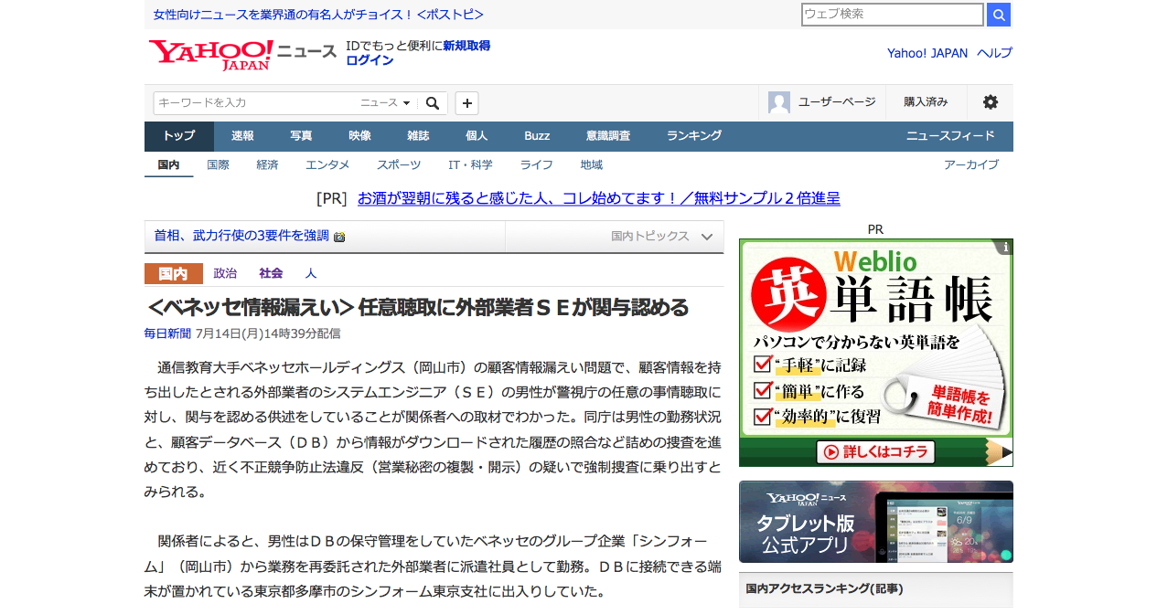 — 渡辺輝人 (@nabeteru1Q78) 2014, 7月 14<ベネッセ情報漏えい>任意聴取に外部業者SEが関与認める(毎日新聞) - Y!ニュース http://t.co/pPZ1yzubfT 情報の売り先を自分で探して売ったのか。それとも第三者が話を持ちかけて実行したのか。そこが気になるなぁ