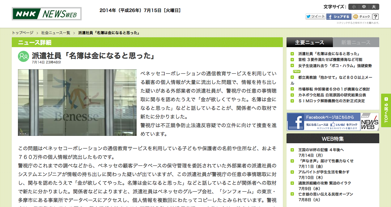 — NAC (@nacamuu) 2014, 7月 14派遣社員「名簿は金になると思った」 http://t.co/UeGCNXkPli ベネッセの件。どこにどれだけの金で売ったのか気になる