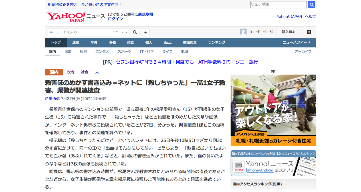 — MakotoBit (@m_b_z_s) 2014, 7月 27殺害ほのめかす書き込み=ネットに「殺しちゃった」—高1女子殺害、県警が関連捜査(時事通信) - Y!ニュース http://t.co/z0yj3ENwSU