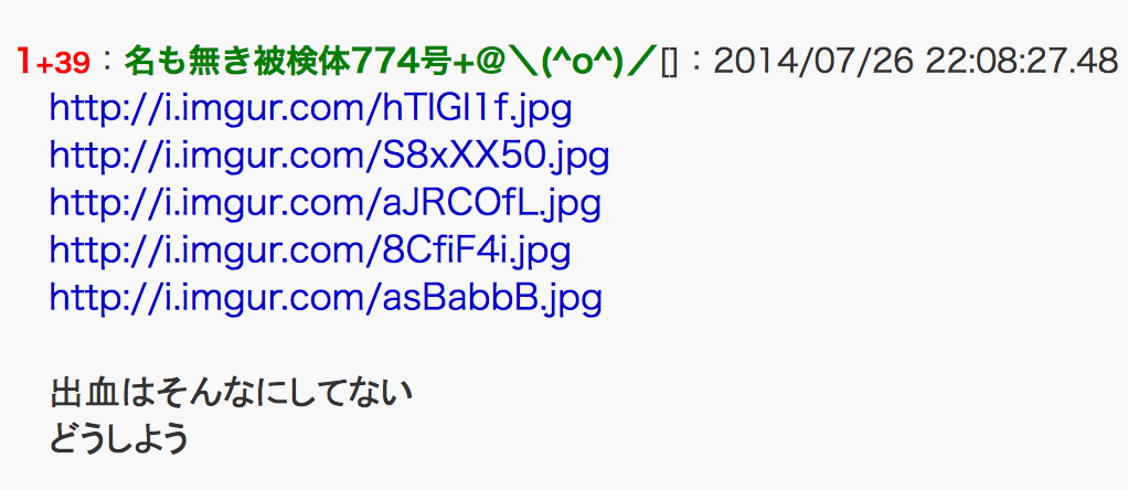 — ぱみゅ男裕太 (@yuturn318) 2014, 7月 27VIP+の模様?確定かどうかは不明。微グロって書かれていたけれど五枚目は理解するとSAN値が減る / “殺害ほのめかす書き込み=ネットに「殺しちゃった」―高1女子殺害、県警が関連捜査 (時事通信) - Yahoo!ニュース” http://t.co/k56hgj8z3y