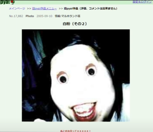 元は2ちゃんねらーが面白半分で作った画像なのに海外ではいじめで自殺した女の画像とかしょーもない都市伝説がある模様