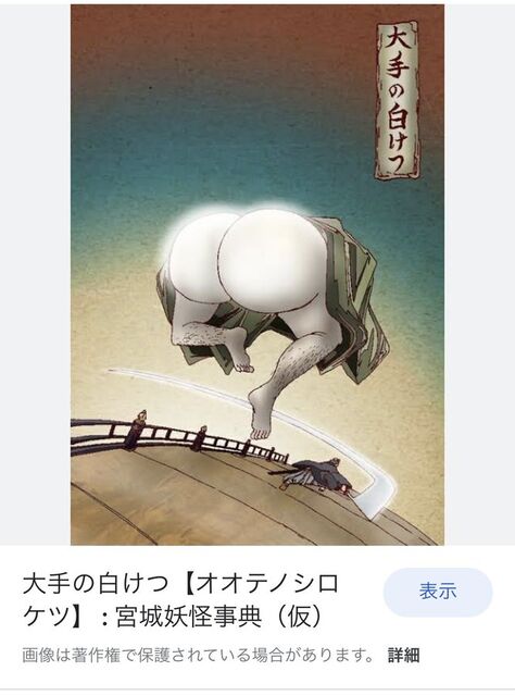 【私の好きな妖怪】大手の白けつ。宮城県登米市の妖怪で、白いけつを出して奇声をあげながら襲ってくる。武士に切り捨てられるが、その正体は近所の変質者であり、そもそも妖怪ではなかったという。 pic.twitter.com/6Mbw0dw31Q
