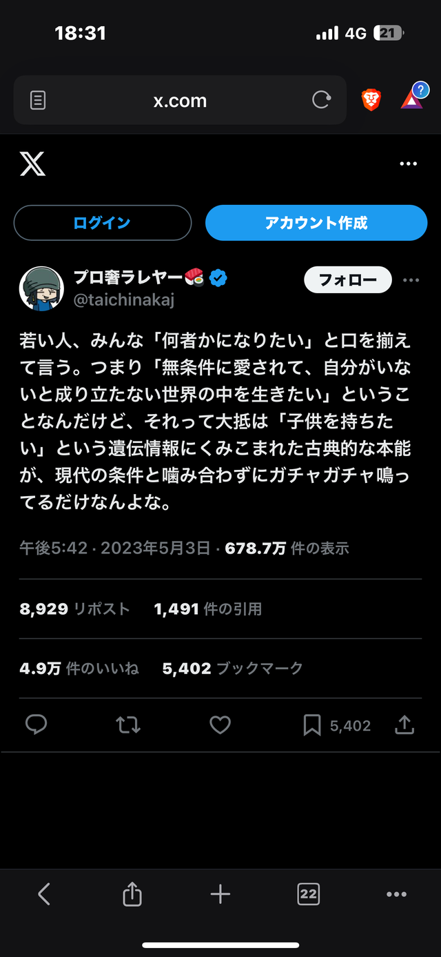 ほぼ無条件に親になって何者かになりたい欲求は無意識に満たされてたけど今はそうじゃないからそれでこういう若者が増えたよね