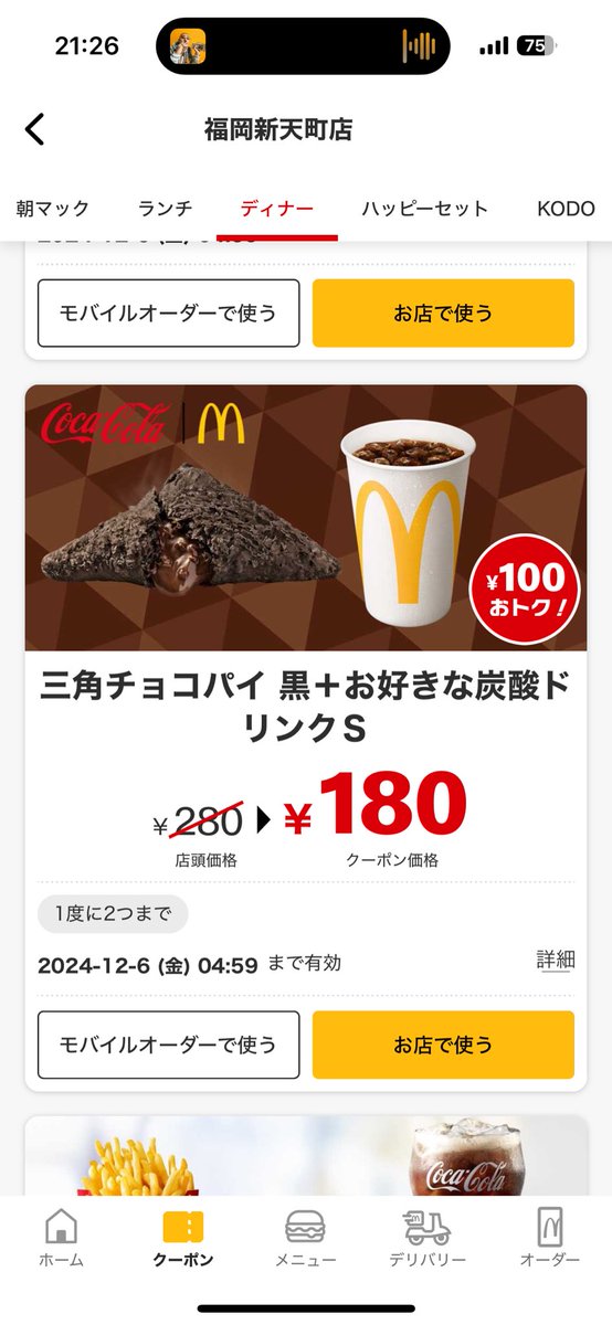 これにkodoクーポンつけたらコーヒー無料で頼めるけど、食欲に負けてポテトs無料➕チョコパイドリンクで180円コースの誘惑に負けそうです。