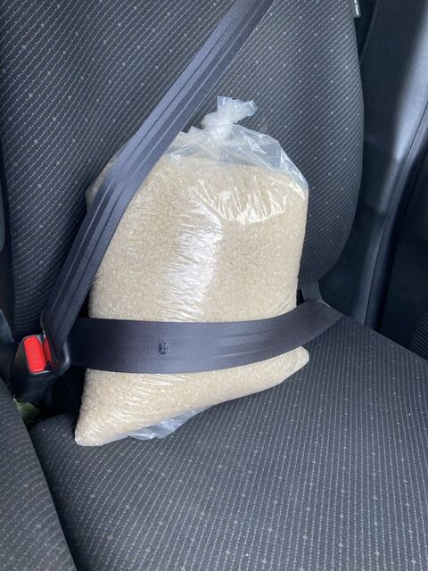 助手席にお米を乗せてたら車が重量を検知して、「助手席の人間もシートベルトをしろ!」ってアラートを鳴らしまくってきたので、お米にシートベルトをしてあげました。 pic.twitter.com/gQi9mSanXu