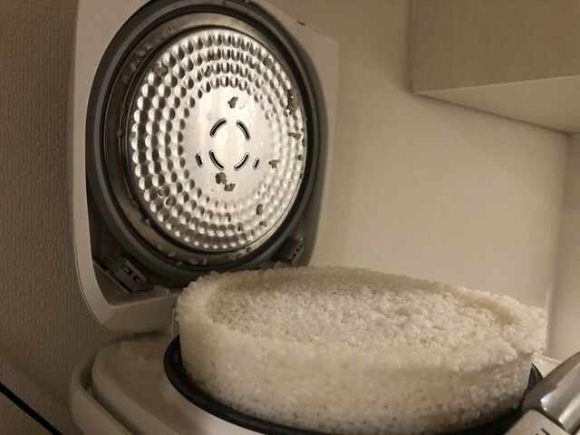 4合炊きの炊飯器なんやけど、こんとき6〜7合くらい入っちゃったけど蓋閉めるし水多めに入れたら炊けるやろと思ってスイッチ押して炊けるの待っとったら気づいたら米が自力で蓋こじ開けてこうなっとったんよね