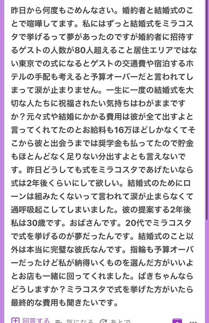 自分が16万しか手取りないのに彼氏の全額負担で80人呼んでミラコスタで挙式?