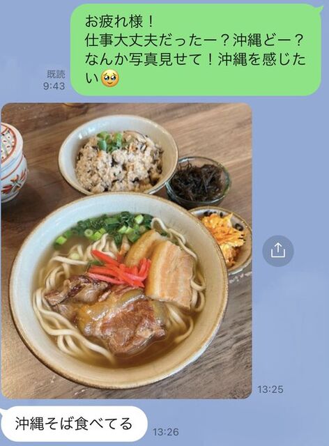 この画像送っときゃいいっしょってなってる画が想像できちゃいますね。沖縄そば食べてるって一言も、普通だったらここ美味しかったなどの感想的な一言なはず。嘘だから”何してるか”の状況を言いたくなっちゃうんでしょうね。博多にいるの?って送ってやりたいですな。