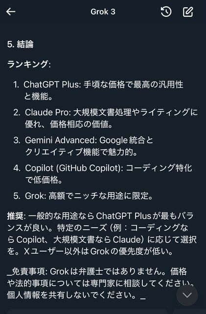 正直、汎用的な会話は4o、調べ物や勉強では3oが圧倒的だから、一般人はGPTの月3000円プランだけ入っとけばいいよ。Grok有料とか金の無駄
