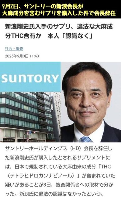 サントリーの新浪剛史(66)会長、麻薬取締法違反の疑いで自宅ガサ入れ